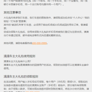 点链接,输入手机号,领取优惠券,参与滴滴快车与携程举办的《夏日来袭》活动,点击领取乘车优惠,可以领取滴滴乘客大礼包:携程酒店优惠券20元,滴滴打车9.8折快车券1张,8折快车券2张,7折快车券1张。