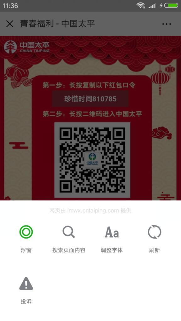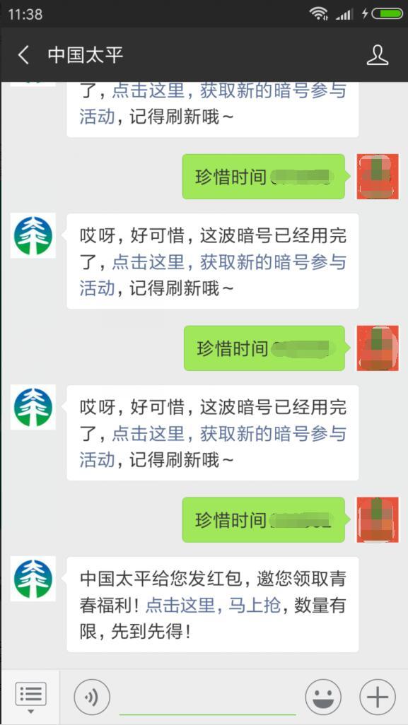 进入微信,点右上角+,添加朋友,公众号,搜索关注 中国天平,关注后,回复 珍惜时间810785,如果提示暗号已用完,选 点击这里,获取新的暗号参与活动。下拉,点阅读原文,然后点右上角,点刷新,每刷新一次,可以获取一个新暗号,回复暗号直到获取红包,可以多试几次哦!