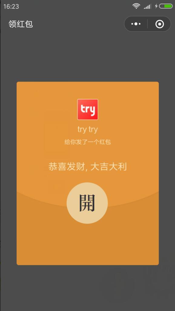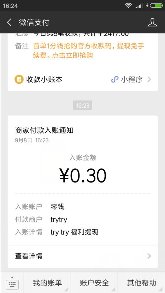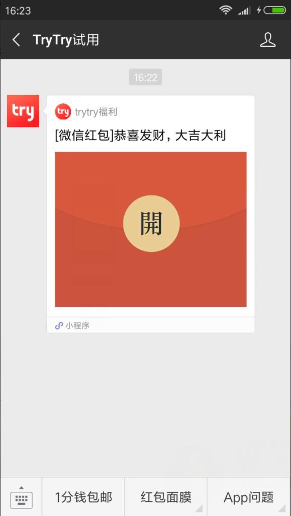 进入微信,点右上角+,添加朋友,公众号,搜索TryTry试用,关注后,点收到的[微信红包]恭喜发财,大吉大利的消息。进入后,点开红包,再点提现按钮,确认将红包提现到零线,小希领到了0.3元。