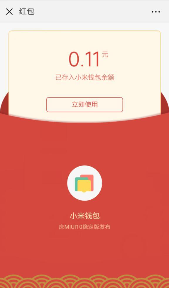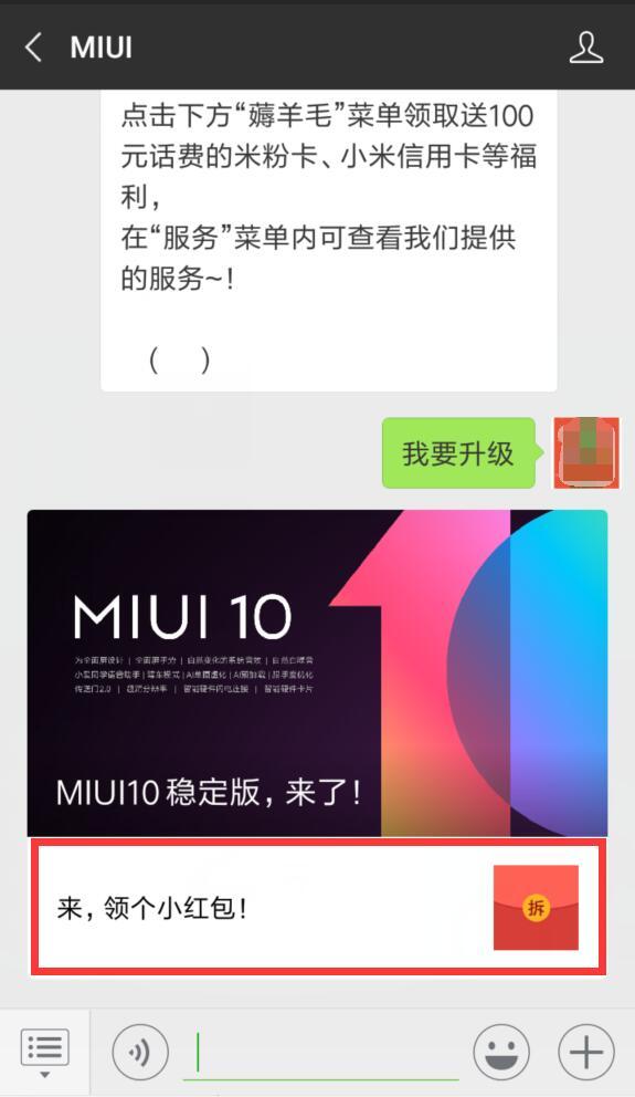 进入微信,点右上角+,添加朋友,公众号,搜索 MIUIROM,关注MIUI后,回复 我要升级,点《来,领个小红包》,登录或注册小米账户,可领取随机金额的现金红包,到账小米钱包,下载小米钱包APP,绑定银行卡可后,可提现。小希领到了0.11元,来,庆祝MIUI10稳定版发布吧!