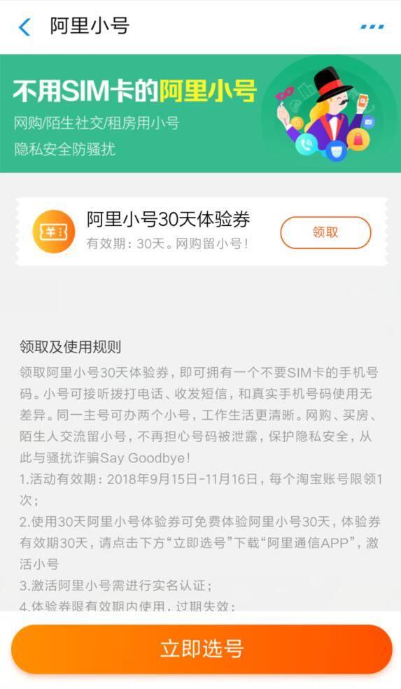 进入支付宝,搜索 阿里小号,关注阿里小号生活号,点右下角小号包月体验权限,领取阿里小号30天体验券。下载阿里小号APP,用领取体验券的淘宝帐号或支付宝账号登录,选号,使用体验券,可以领取小号30天,如果已经有阿里小号,可以点小号,点延长有效期,可以将小号延长1个月有效期。