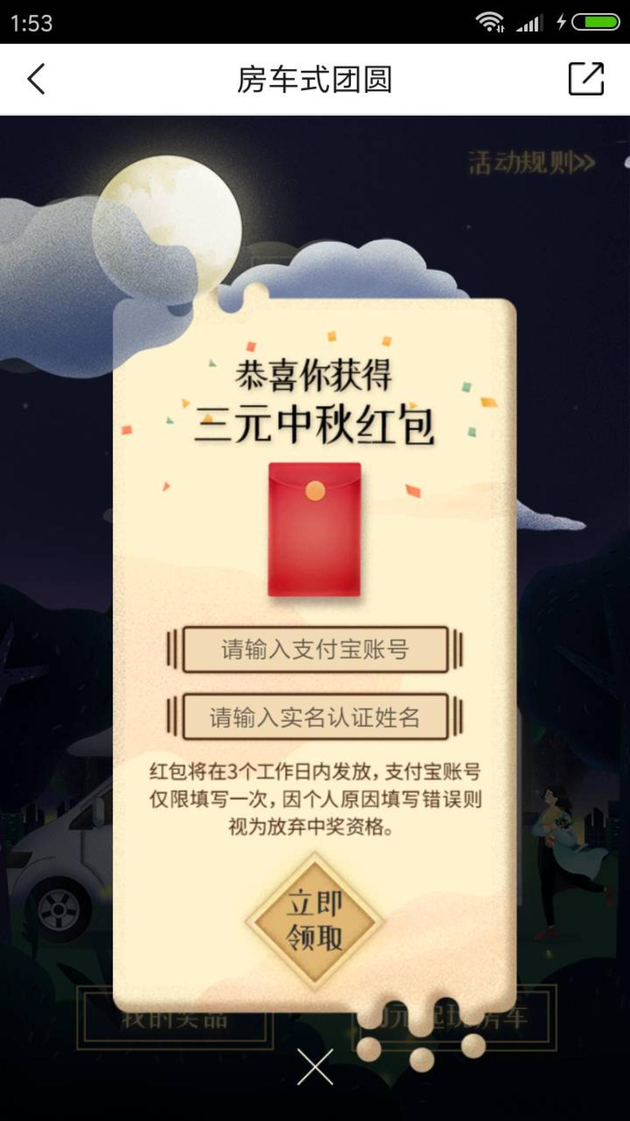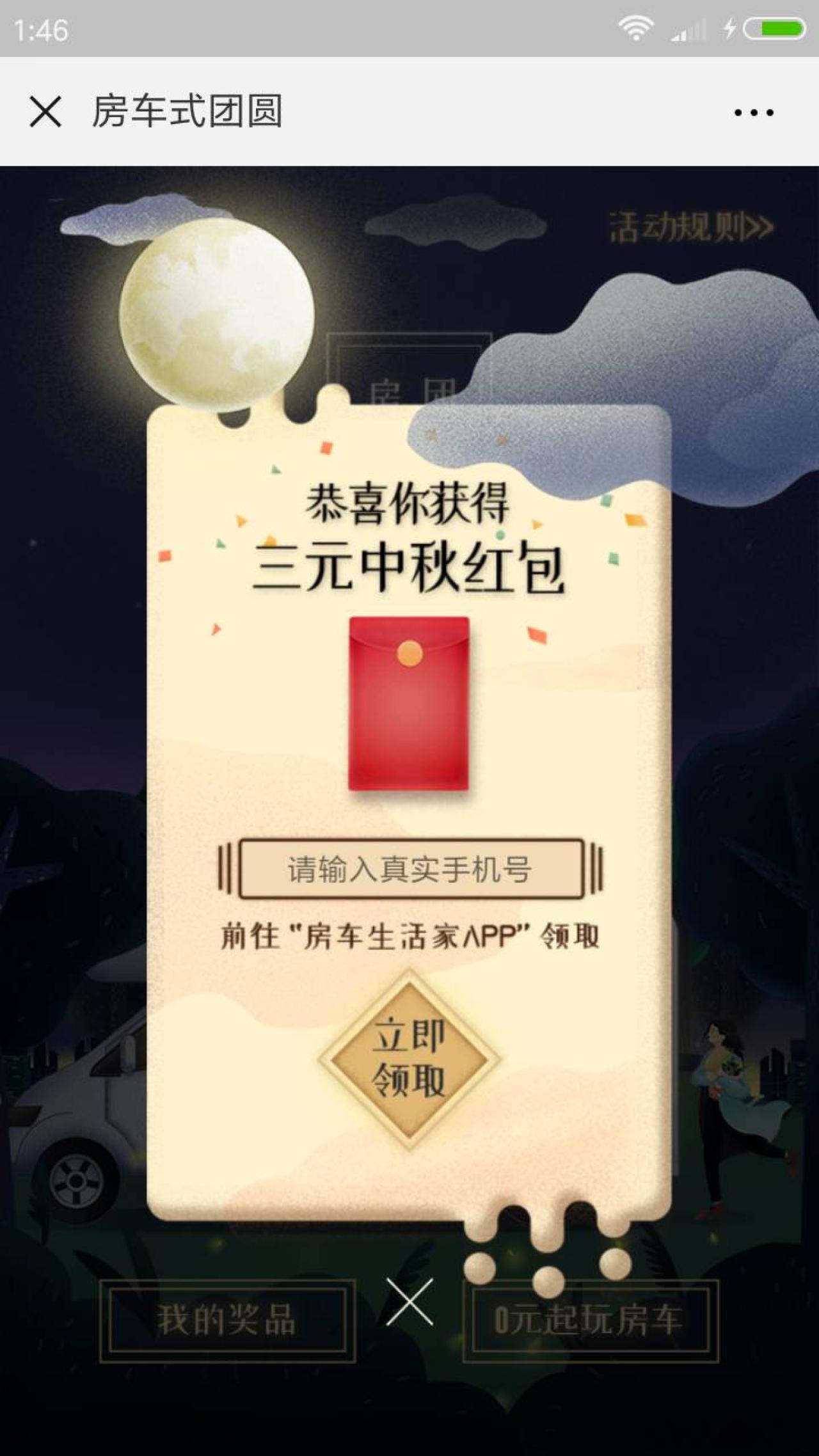 进入微信,点右上角+,添加朋友,公众号,搜索 房车生活家,关注后,找到历史消息里《嘘!有人偷偷送你一份中秋大礼》,下拉,点阅读原文,点屏幕,点领取中秋礼品,有几率抽到红包,输入真实手机号,点立即领取,下载房车生活家APP,安装后,点中秋横幅,登录后,输入支付宝和姓名领取红包。