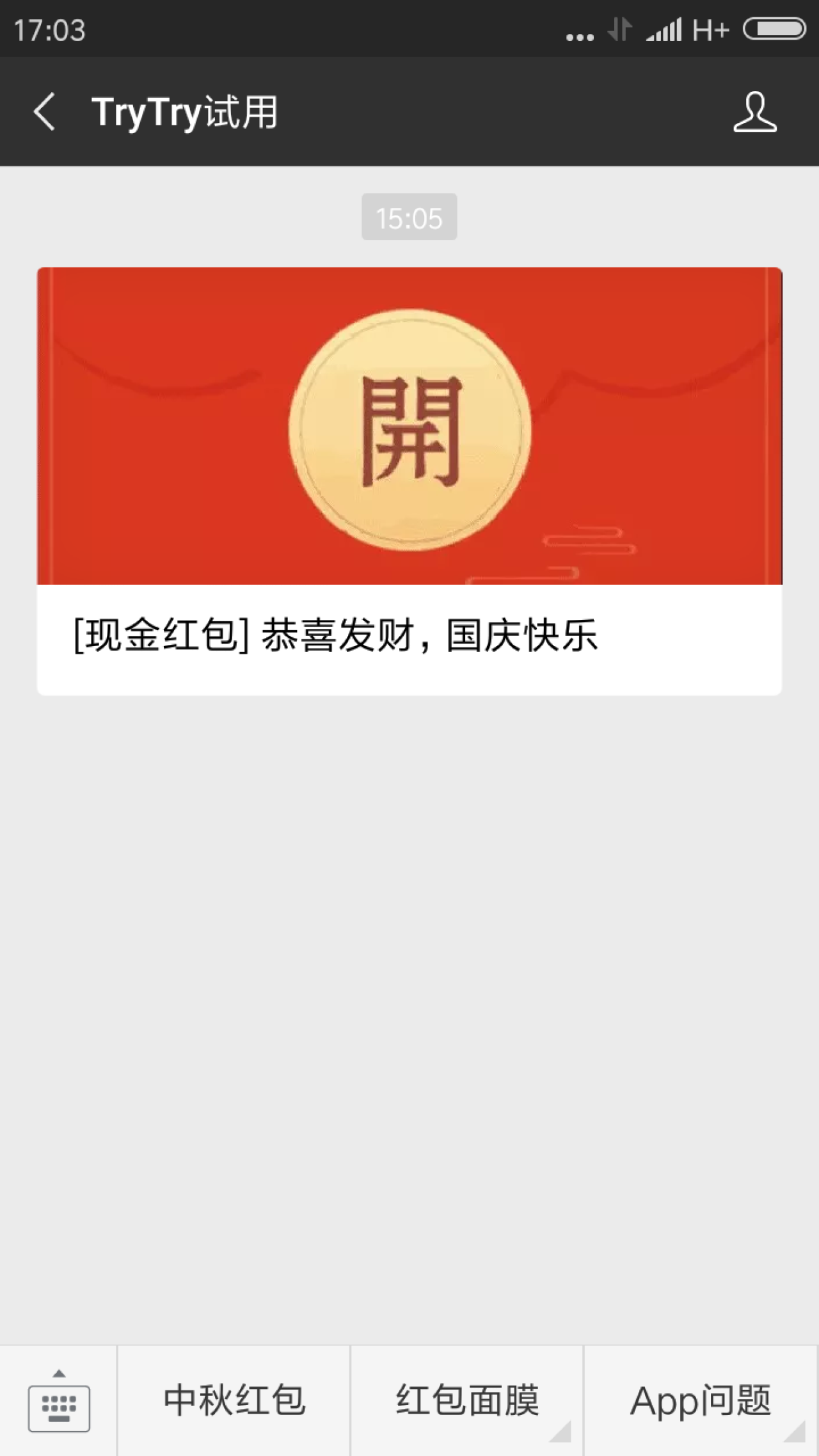 进入微信,点右上角,添加朋友,搜索 trytry试用,关注后,点历史消息,找到国庆节红包,点进去,授权微信,有机会获得随机金额的现金红包,输入收货地址,还可以免费领取价值10元的面膜。