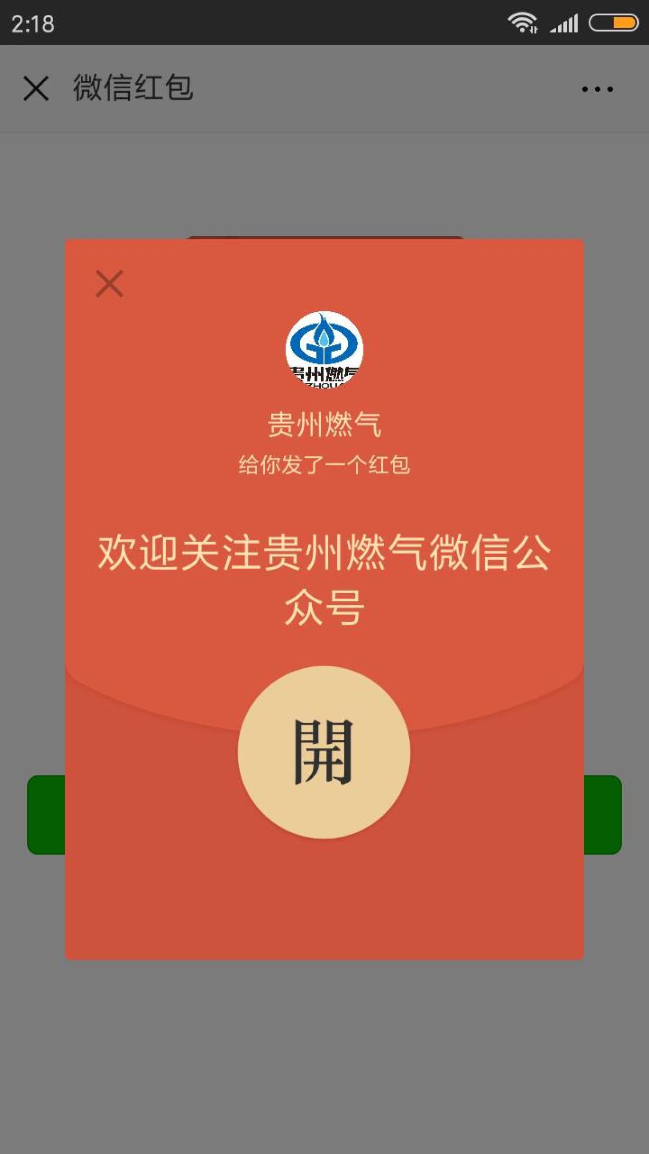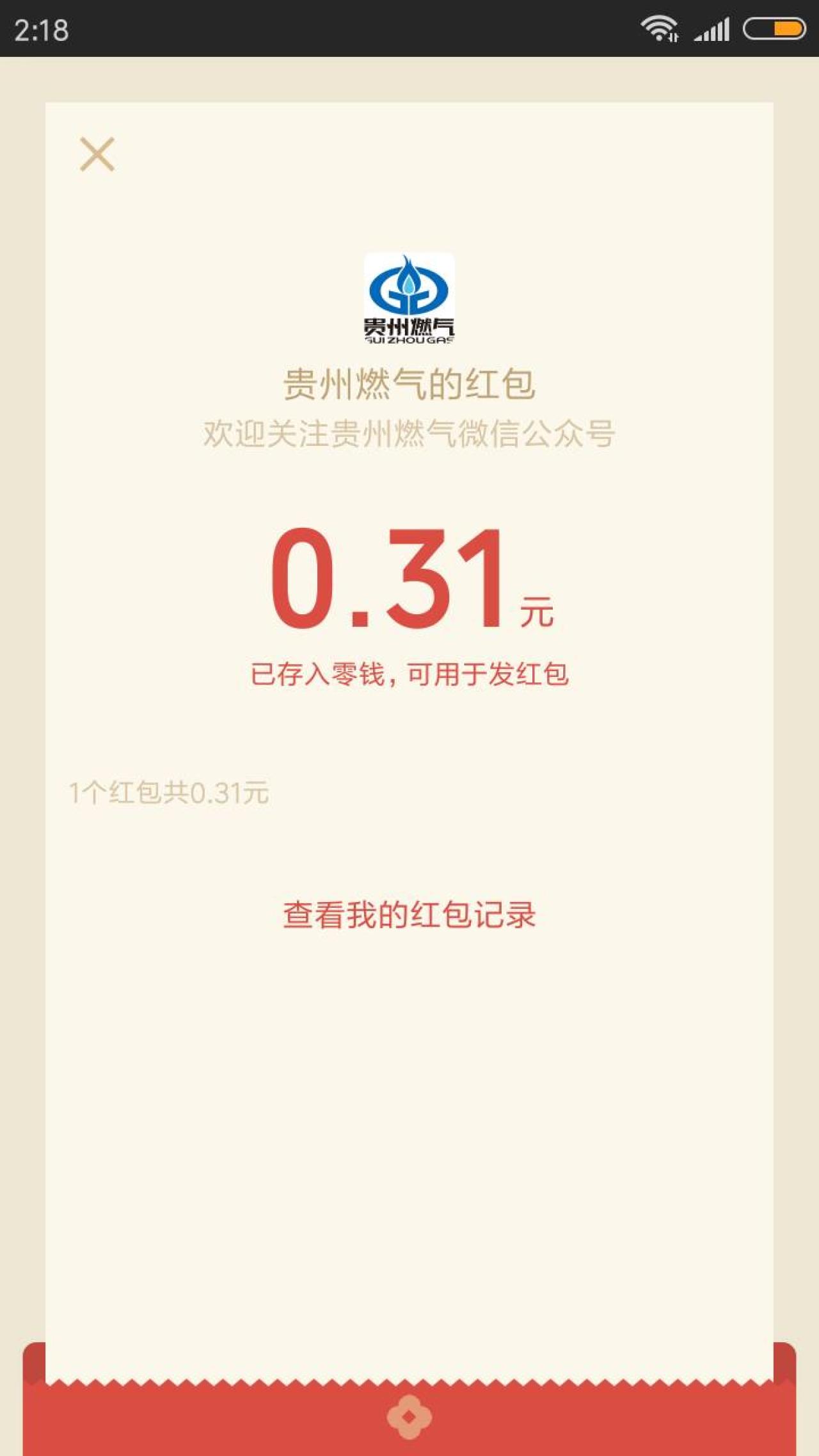 进入微信,点右上角+,添加朋友,公众号,搜索 贵州燃气,关注后,会自动收到一个红包,点红包消息,可领取随机金额的现金红包。小希领到了0.31元。大家可以试试运气,金秋活动关注红包数量有限,先到先得!