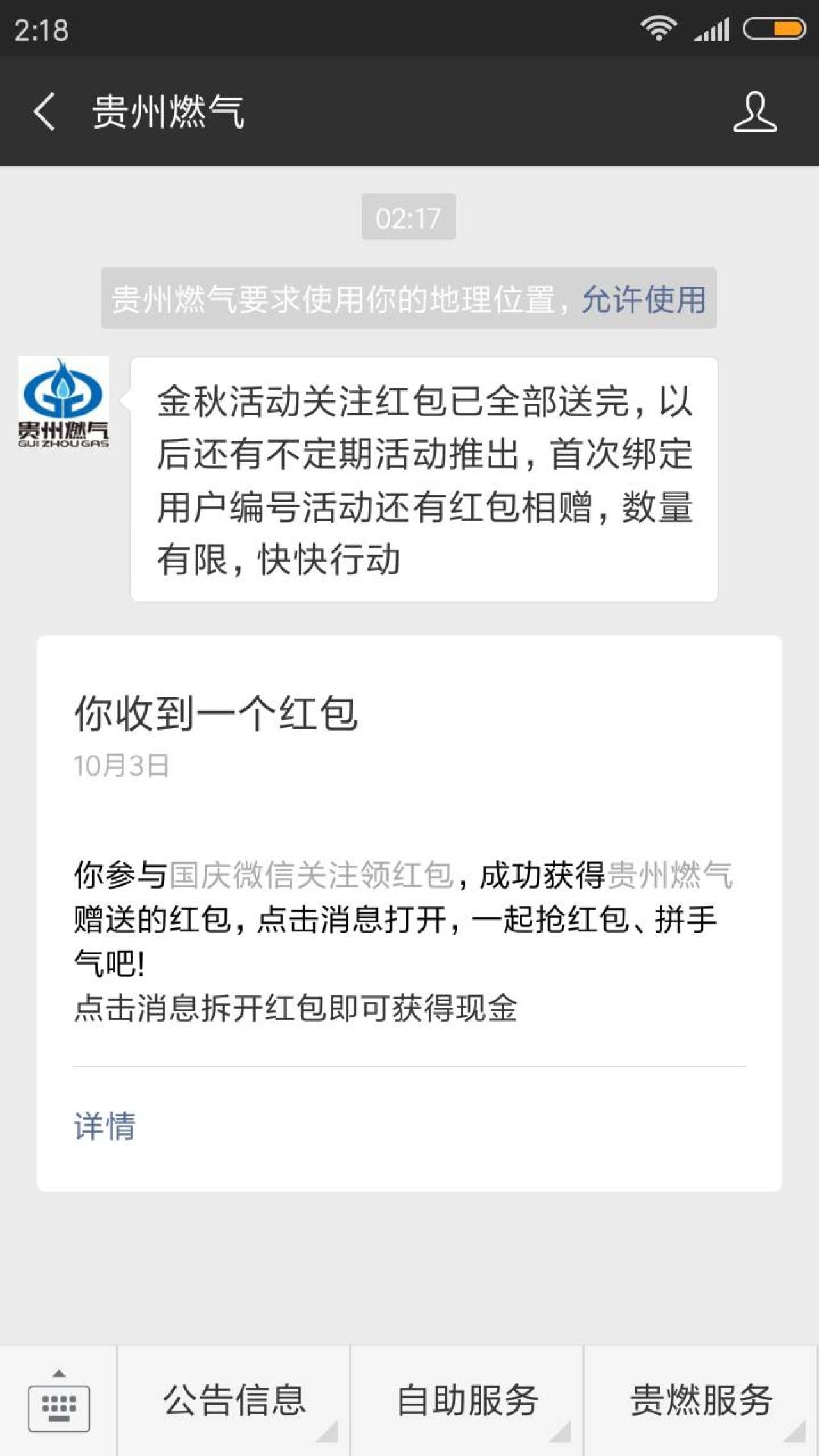 贵州燃气现金红包 金秋关注活动