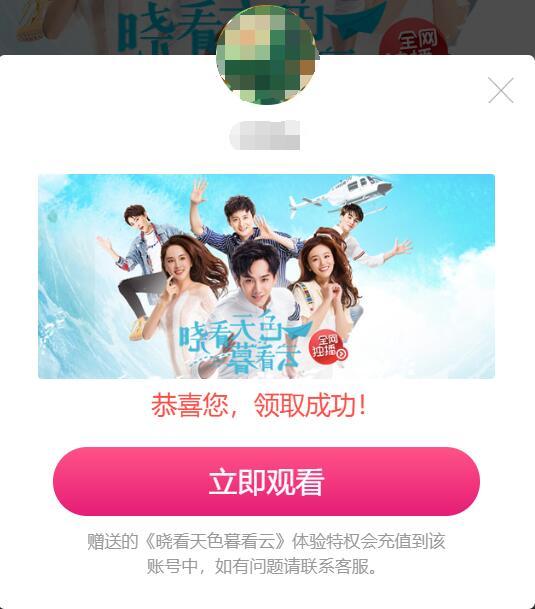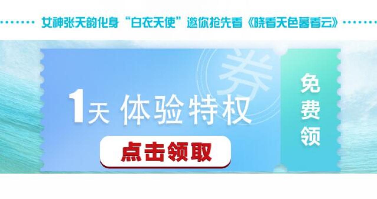 点链接,下拉到页面中部,点击领取1天体验特权,可领取《晓看天色暮看云》1天体验特权:可以免费观看《晓看天色暮看云》,并享受免广告权益,不可观看其他付费视频。本权益适用于pc/手机/ipad端,不可用于tv端。