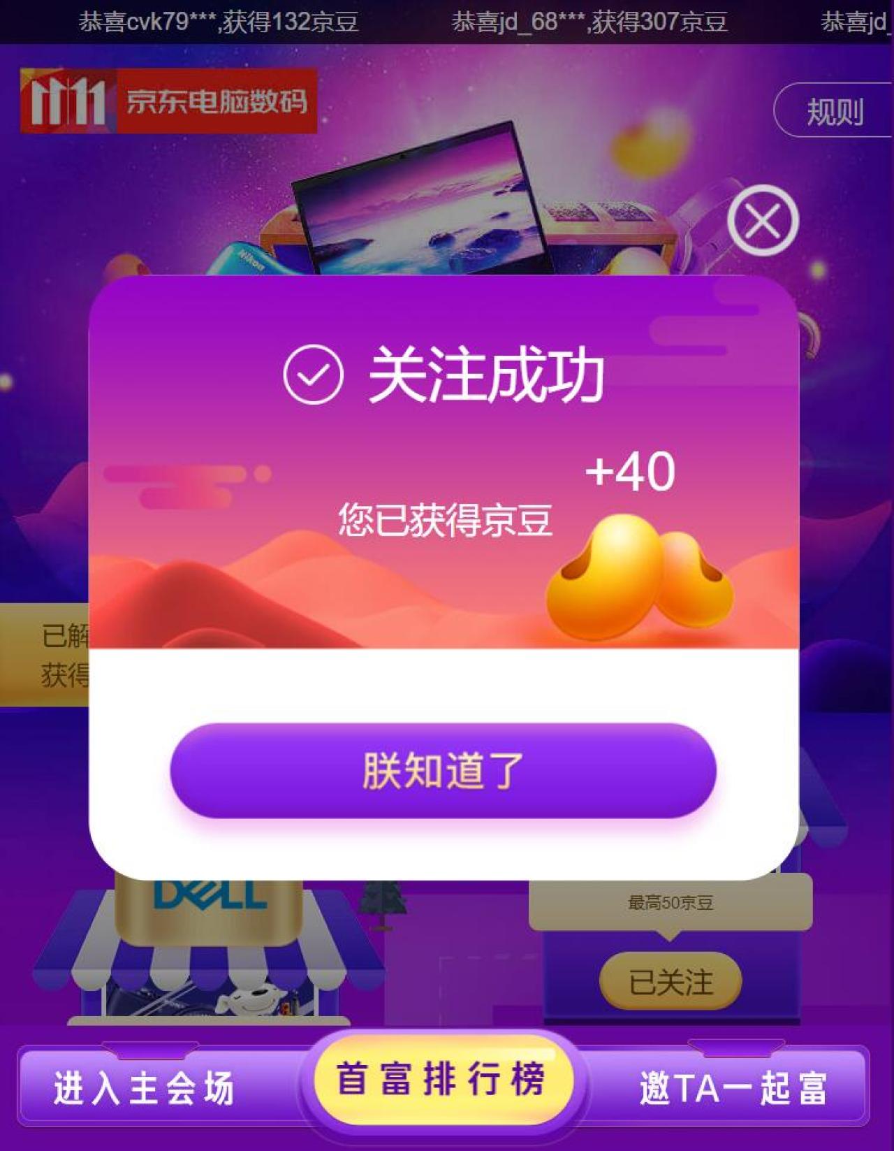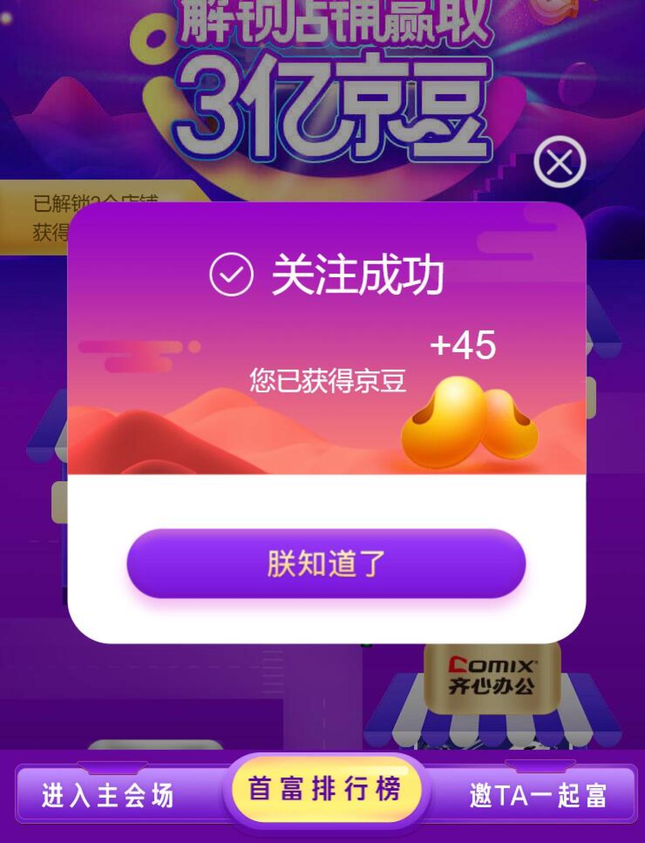 点链接,登录京豆帐号,助力后,点我也要瓜分3亿京豆,进入活动页面,点关注按钮,关注京东店铺,前3个店铺,每个店铺可以获得40~50个京豆,到了4个店铺,需要像小希一样邀请他人助力解锁。不邀请人的情况下,小希领了132京豆,大家可以试试运气哦!