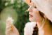 双马尾麻花辫穿着白色连衣裙花戴着草帽少女右手手指捏着雏菊侧脸的脸部特写 侧脸照