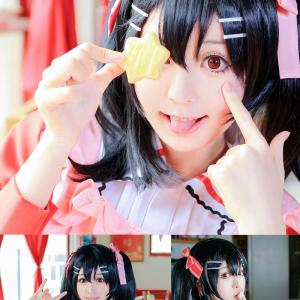 作ILOVEYOU手势,吐舌卖萌的可爱厨娘,溢灯灯穿着连衣裙扮演《LoveLive!》饼干烘焙屋中的矢泽妮可,摄影师江山open作品。附人设图。